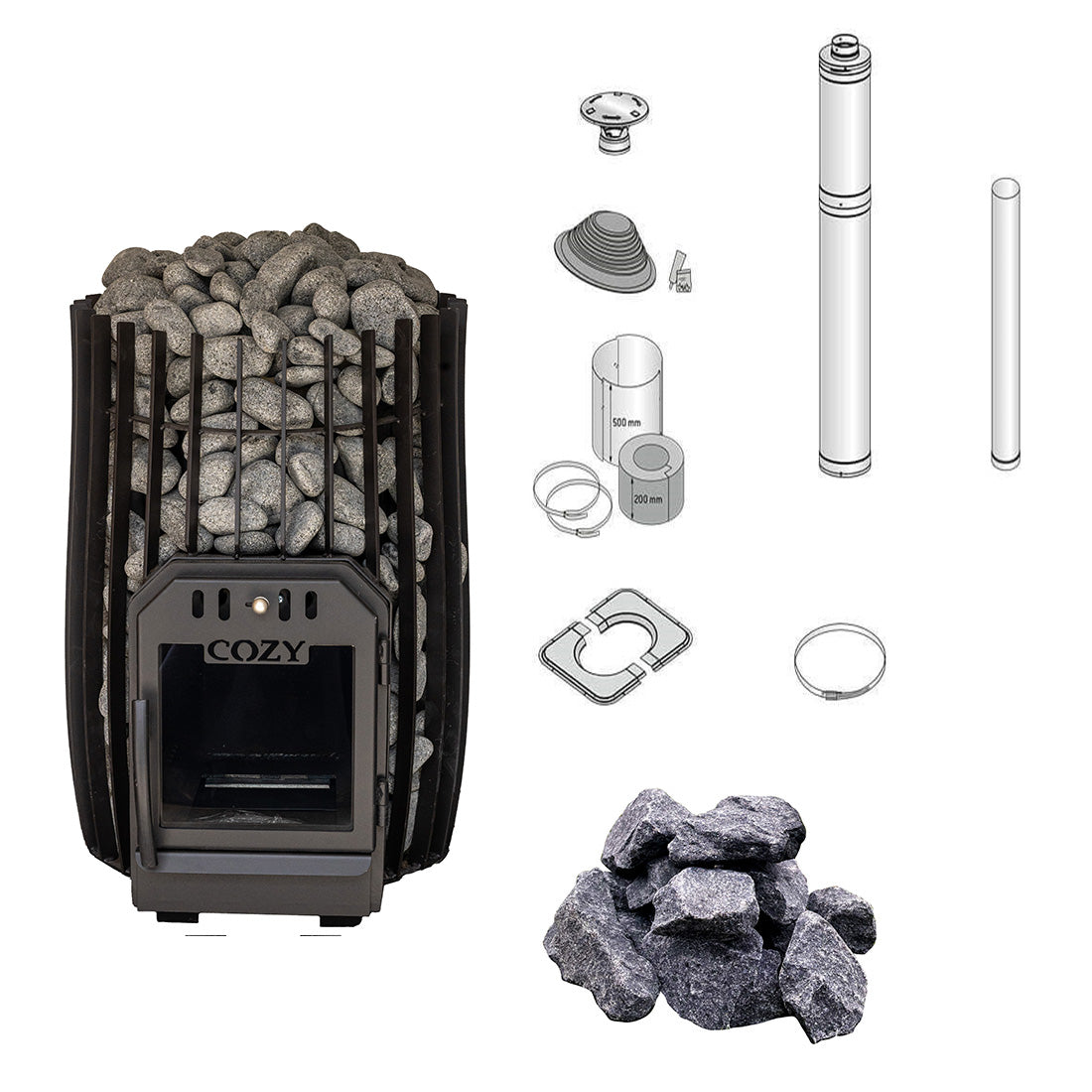 Cozy 18 SW | Saunaofen Holz Komplettset mit Zulassung BimSchV Stufe 2 - inkl. Schornsteinset nach Wahl & 100 kg harvia Saunasteine 10-15 cm