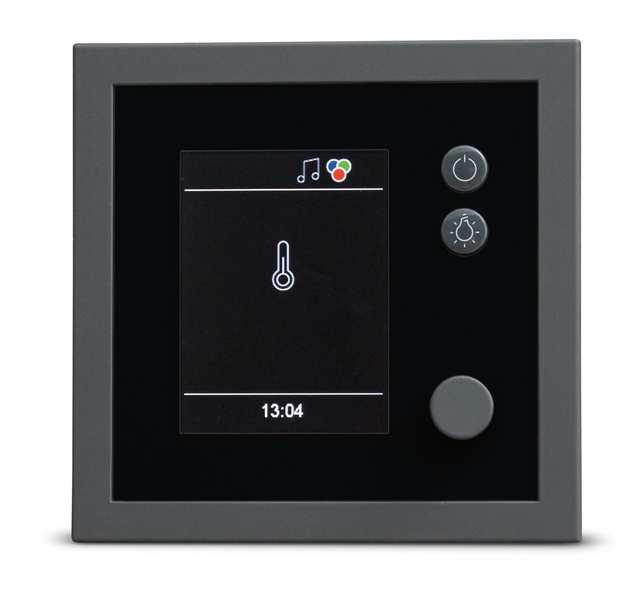 Das kompakte Bedienteil mit hochwertigem TFT-Farbdisplay ist in Anthrazit, Schwarz oder Weiß erhältlich. Die intuitive Bedienung erfolgt über ein Drehdruckrad mit klaren Symbolen und Klartextangaben, unterstützt durch eine Menüführung in 19 Sprachen. Flexible Montageoptionen erlauben die Installation bis zu 100 m von der Sauna entfernt, sowohl auf als auch unter Putz.