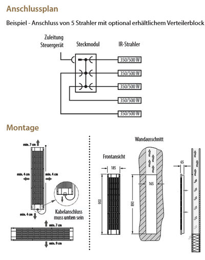 Dank der flexiblen Konstruktion kann der Infrarotstrahler entweder in einer 90°-Ecke oder direkt im Wandelement montiert werden. Ein integrierter Reflektor, ein Schutzgitter sowie die vormontierte 3 m Silikon-Anschlussleitung sorgen für Sicherheit und eine einfache Installation.