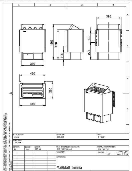 FinTec Irminia wahlweise  6 kW / 9 kW Saunaofen (keine Steine enthalten)