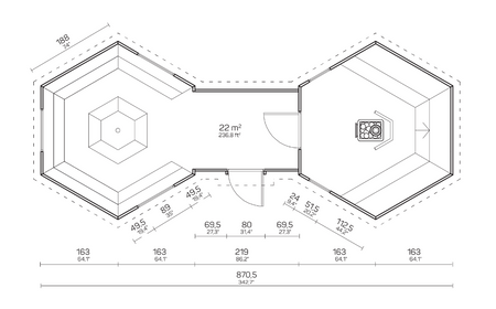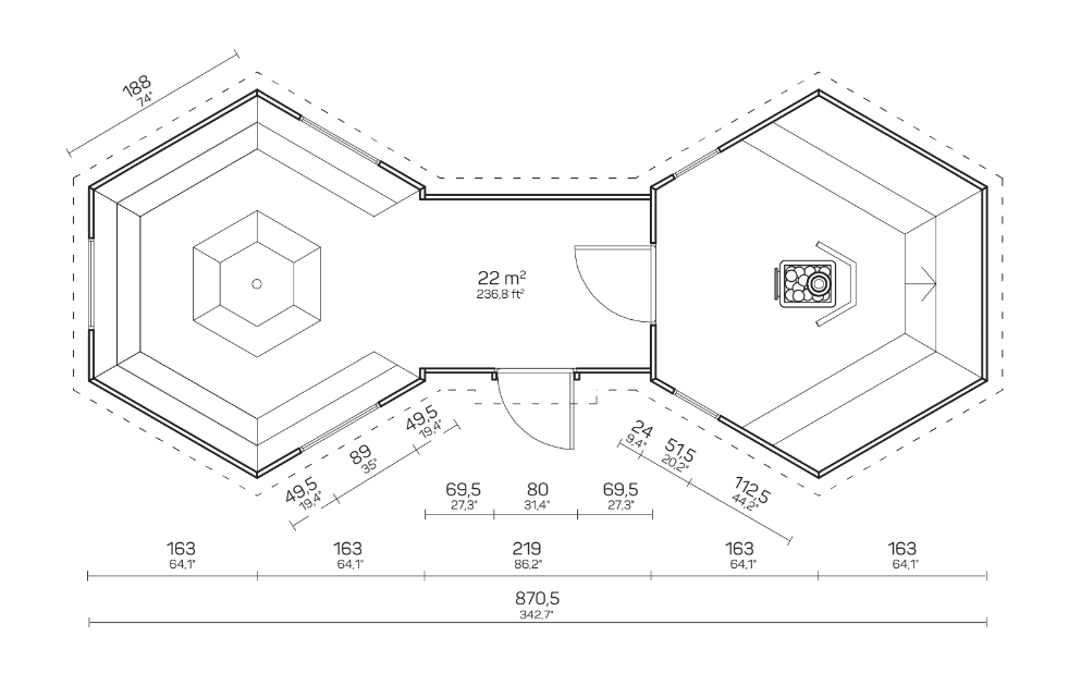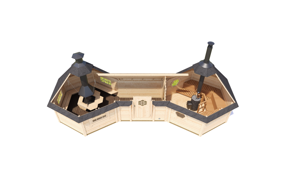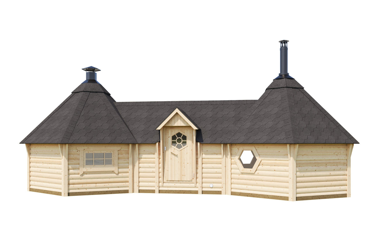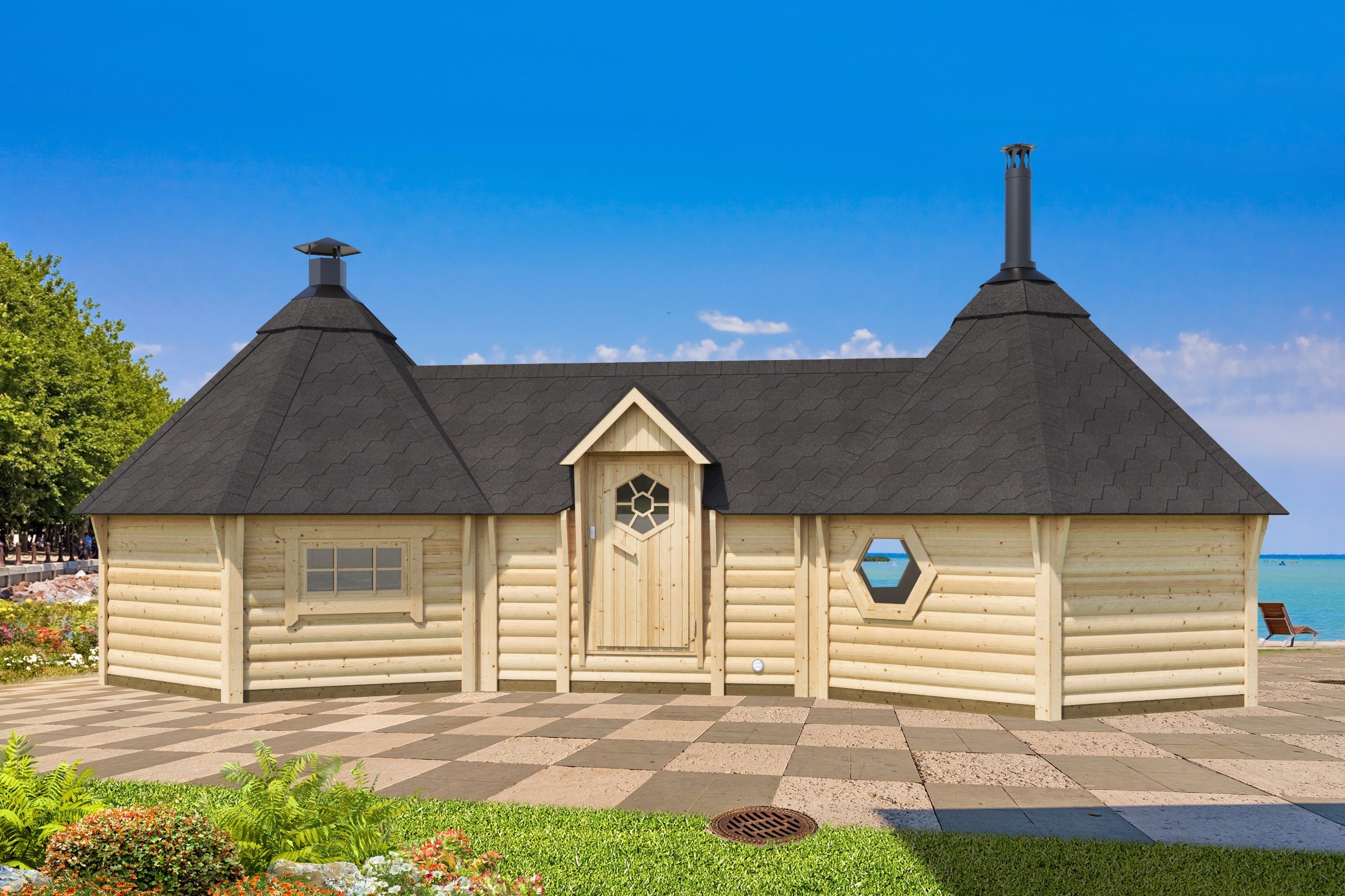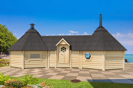 wellmia® Kota Jari | Grillkota mit Sauna 22m² | 861.5 cm x 367 cm x 310 (B x T x H)